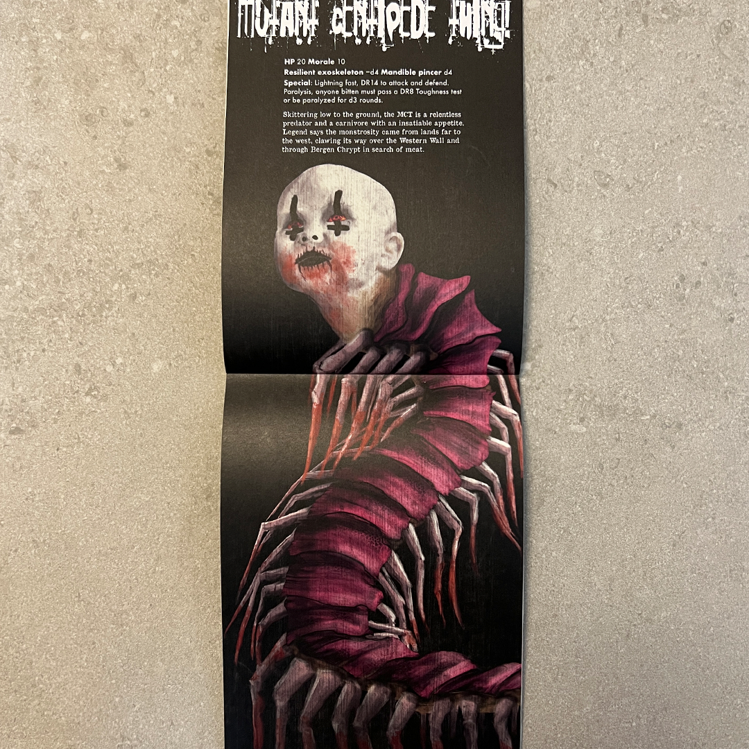 Three adventures of subterranean mayhem. Face off against interdimensional horrors, a drug-fueled cult and their terrifying god, and the unrelenting predation of the Mutant Centipede Thing!