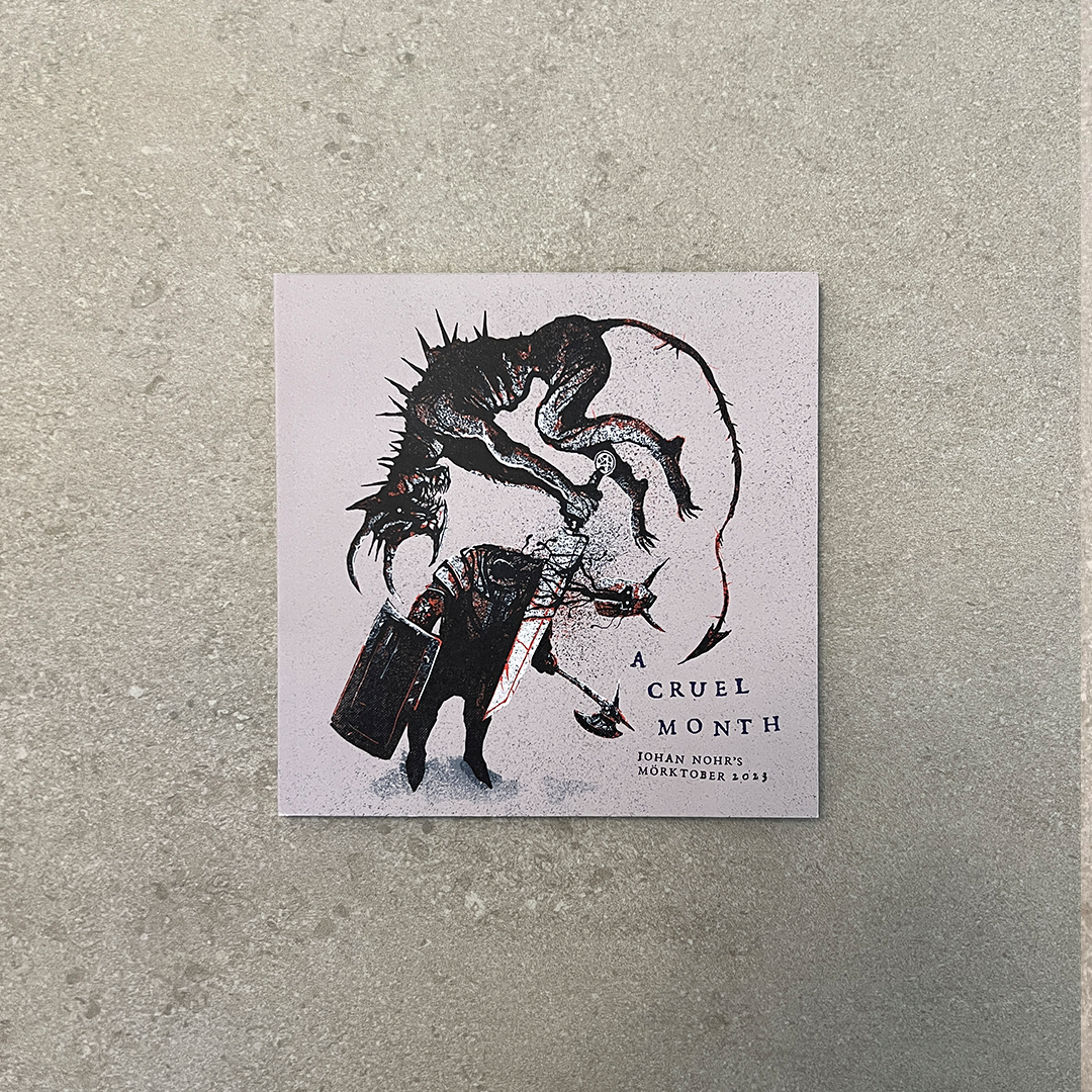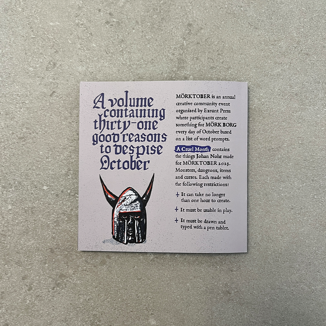 A Cruel Month is a collection of 31 one-page, horrible things made by Johan Nohr as part of the annual community event MÖRKTOBER (organized by Exeunt Press) where participants make something for MÖRK BORG every day of October. Deal with the Tooth King, visit the hamlet of Blight, encounter the Fish that Walks, and play the Eternal Flute for good measure. Surely, nothing bad can happen?