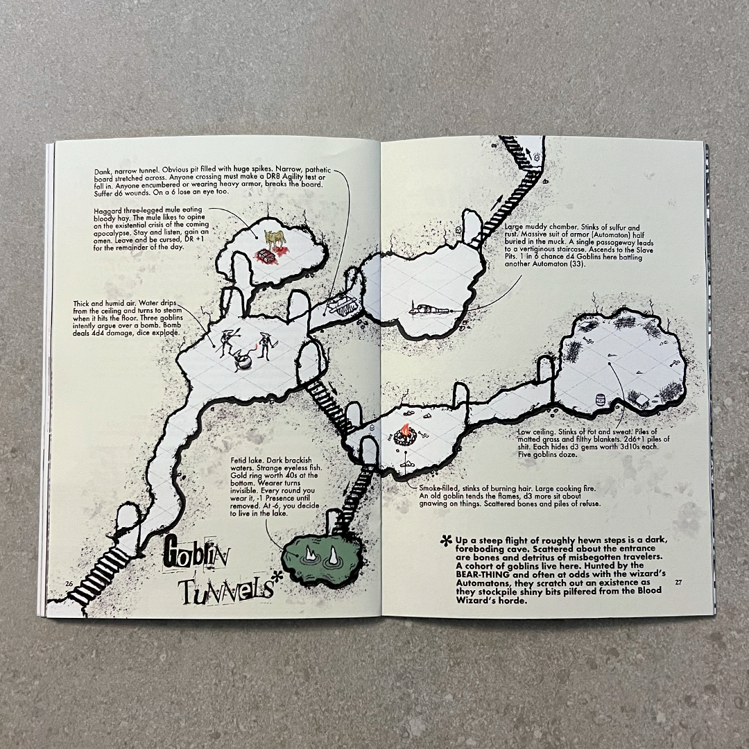 Forty-four pages of madness and mayhem to make your players suffer in The Dying World! Plumb the depths of Death's Fort in search of the riches hidden within. Scale the volcano of The Shattered Tunnels to take on the evil Blood Wizard. Wander the Sarkash in search of The Shrine of Evil. Three unique offerings for MÖRK BORG consisting of a procedurally generated dungeon, a point crawl, and a hex crawl; all in one tome.