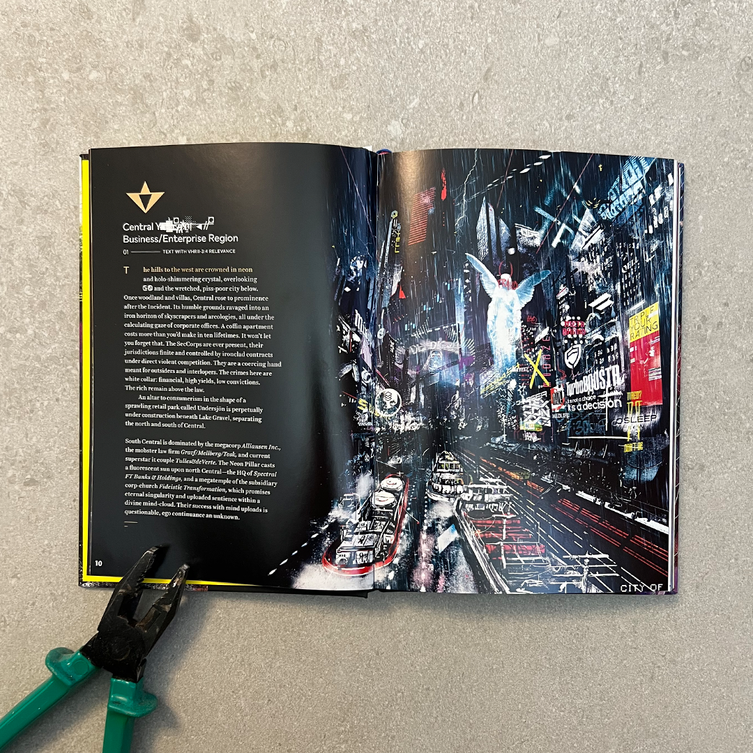 - A drive-by description of the megacity Cy after the Incident: from its rotting slums where gangs, cults and military corporations wage war, to the blinding scraper forests, neon cathedrals and holo-shimmering arcologies of Central and the toxic industrial hell zones shrouding it all in poisonous (but CYstainable Planet™ Certified) death smog.