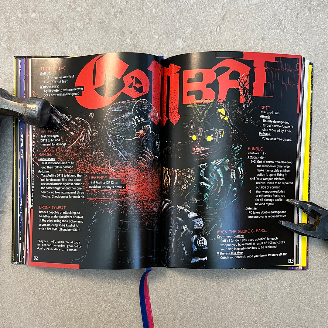 - Quick and dirty character creation where the roll of the dice determines who your punk is, what they’re capable of and who they owe money to.
