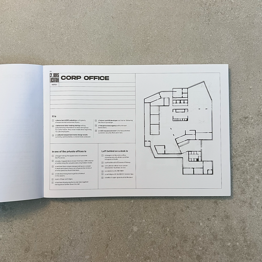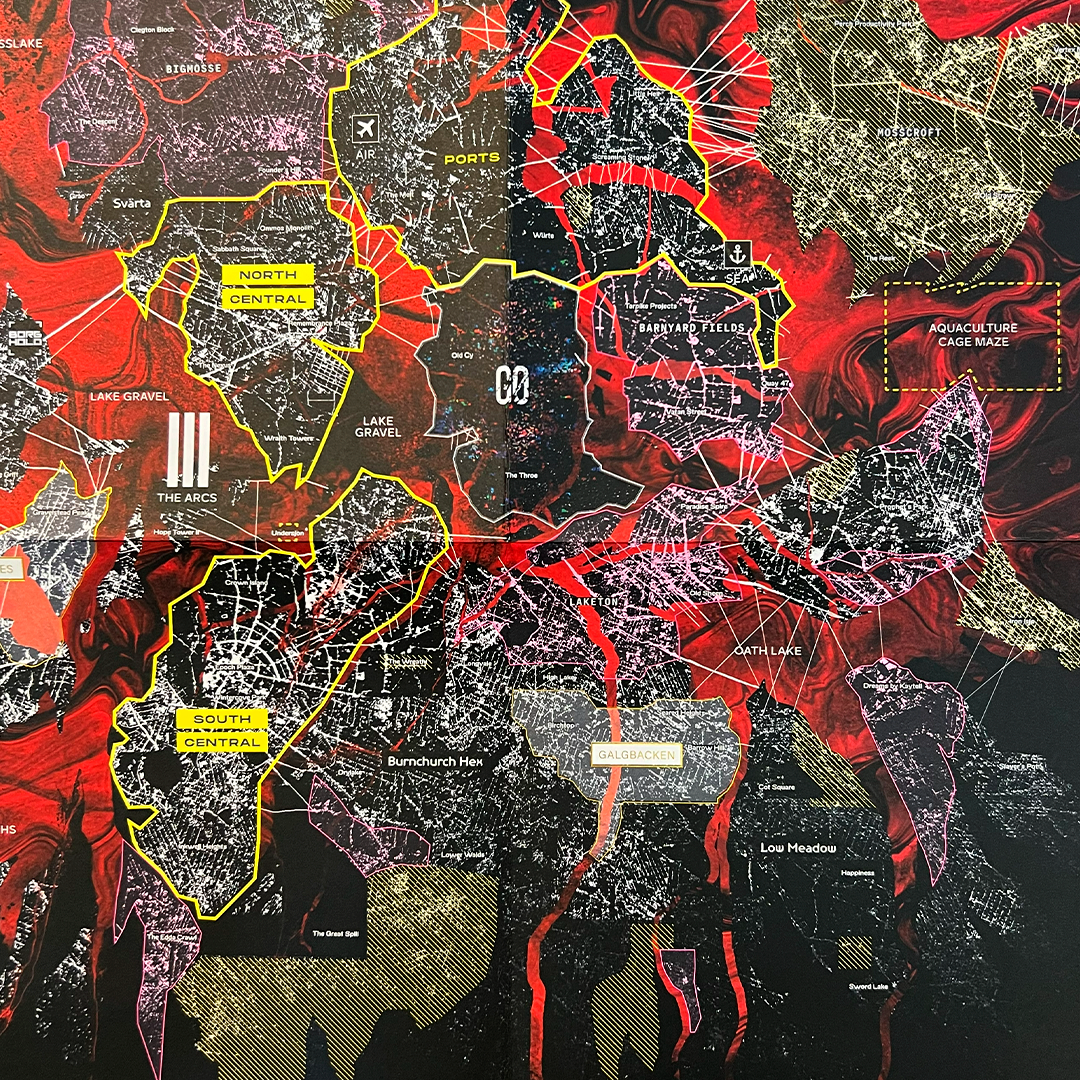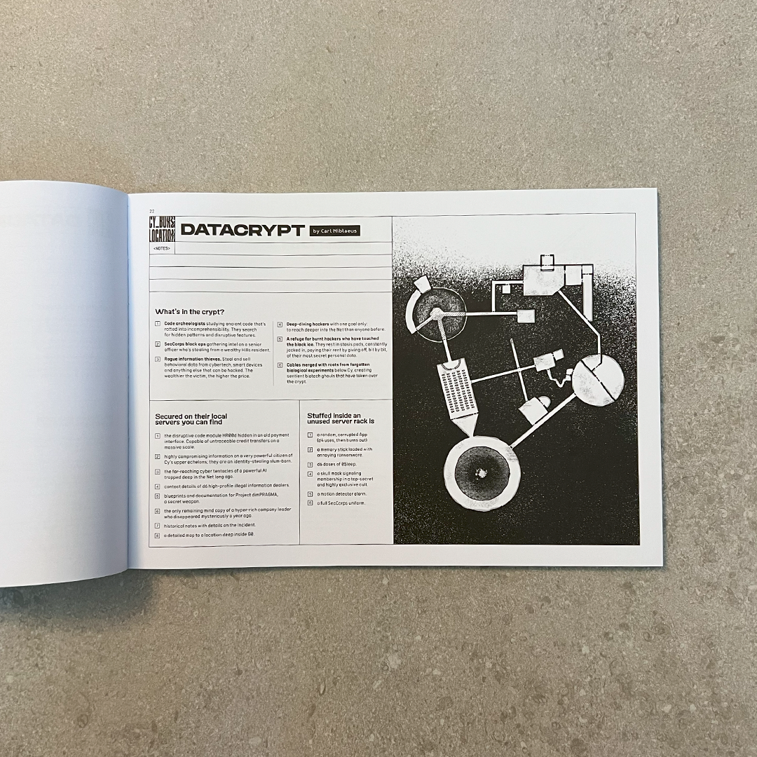 - A big (A2 size) poster map of Cy with its sectors and blocks, and a summary of its most prominent corporations and cults. For target practice.