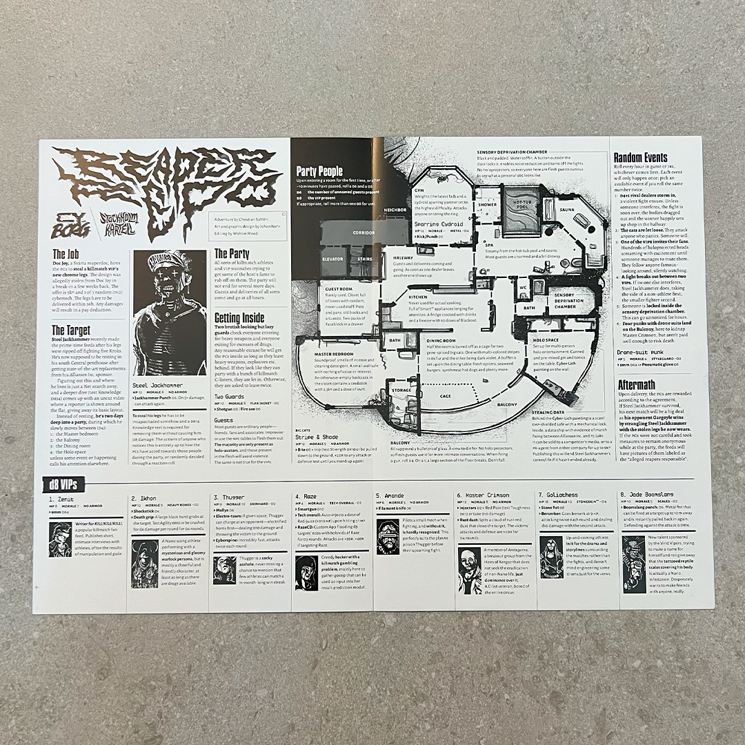 - The one-page adventure Reaper Repo. Approach the killmatch champion Steel Jackhammer and recover his shiny new, and allegedly stolen, chrome legs (undamaged). There are only two problems: the legs are very much attached to Jackhammer, and he is—since two days ago—busy partying in his penthouse, along with a horde of drunk or stoned killmatch athletes, enthusiasts and other C-list VIPs. Let the party begin!