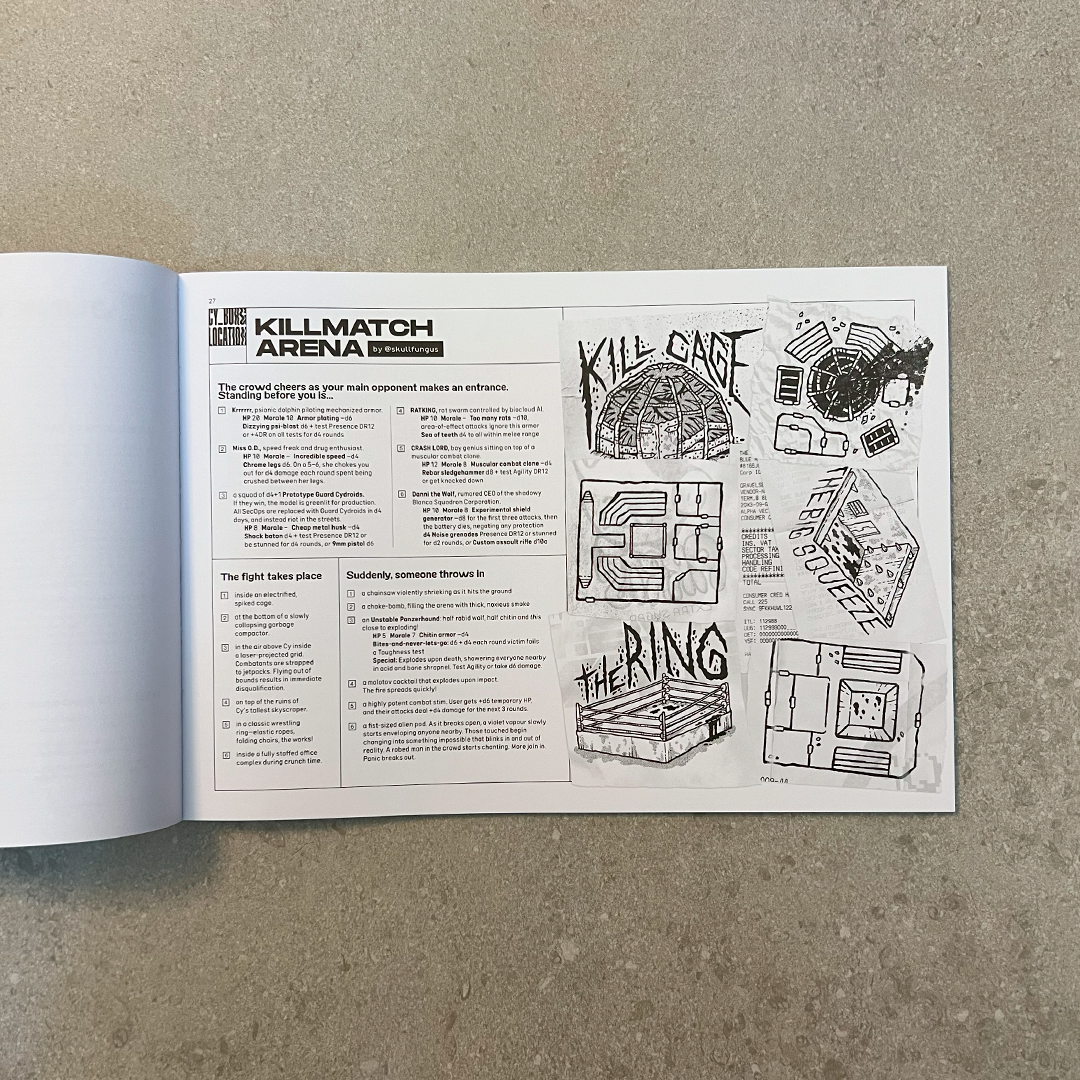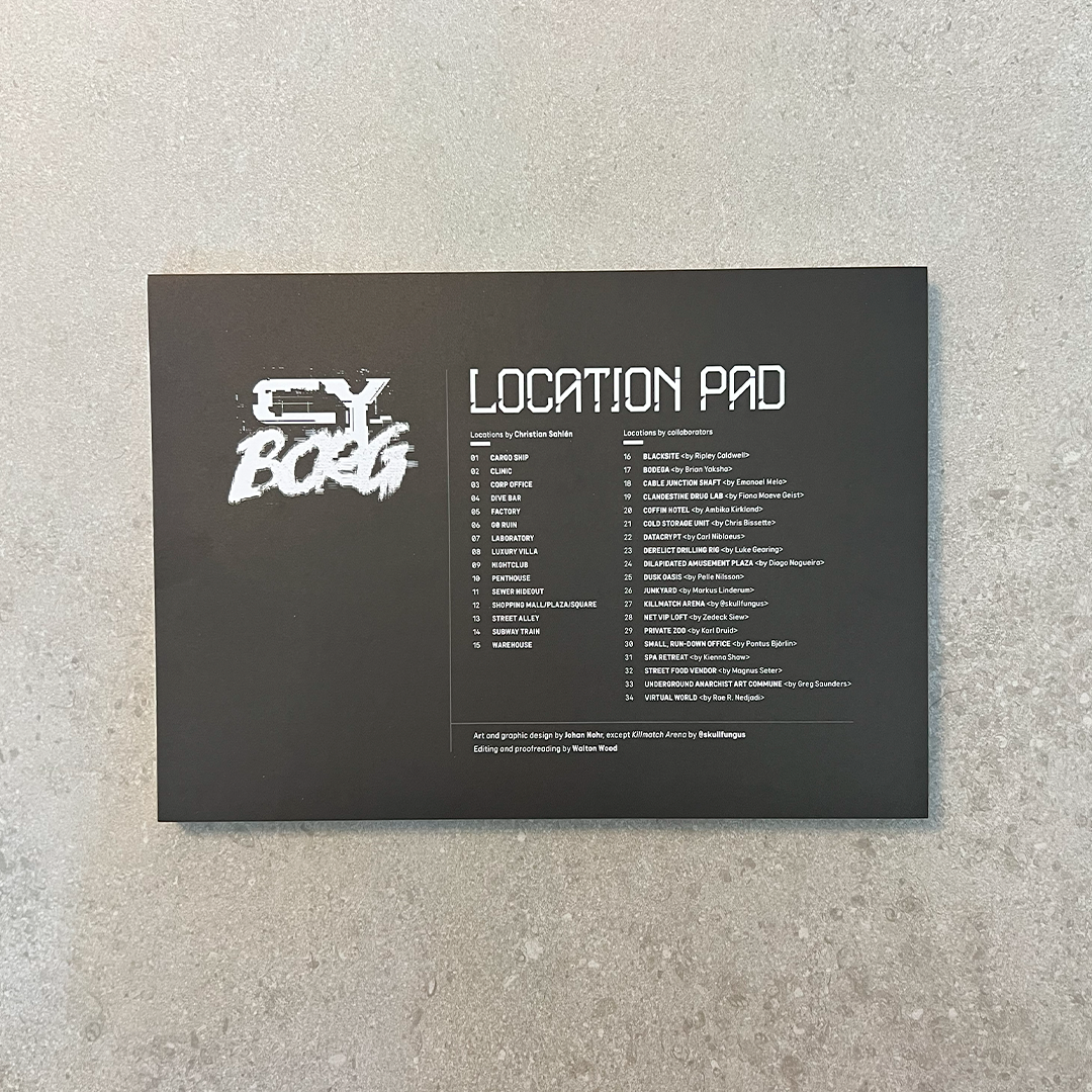 - The Location Pad; 34 one-page locations with adventure hooks, random encounters, secrets and loot. Three copies of each, so that you can tear them out and doodle on them with good conscience.