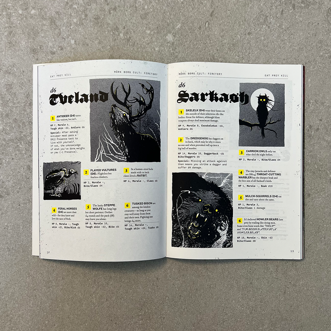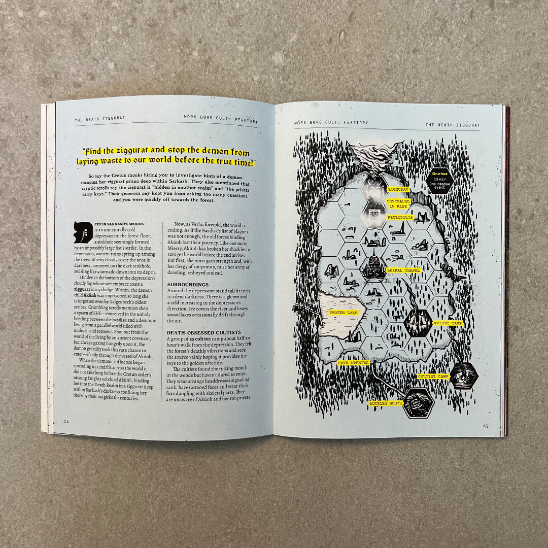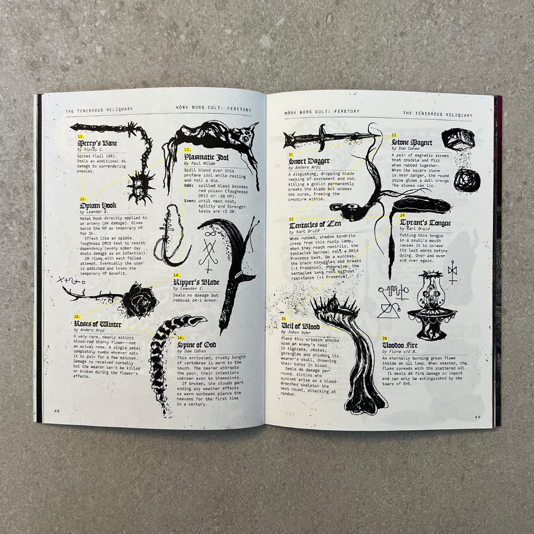 MÖRK BORG CULT: FERETORY is a sinful zine full of community made classes, adventures and horrible treasures for use with MÖRK BORG or other rules-light dark fantasy games. It includes: