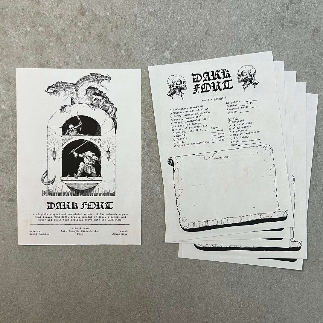 - Dark Fort: Included in the zine is also the micro/solo dungeon crawling game DARK FORT and a couple of character sheets for that game.