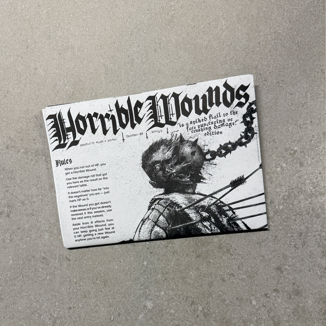 Alternative death/broken mechanics for MÖRK BORG by vil, including a simple way to deal with trauma and mental damage. Also, it's a giant poster (A2, so 420×594 millimeters).