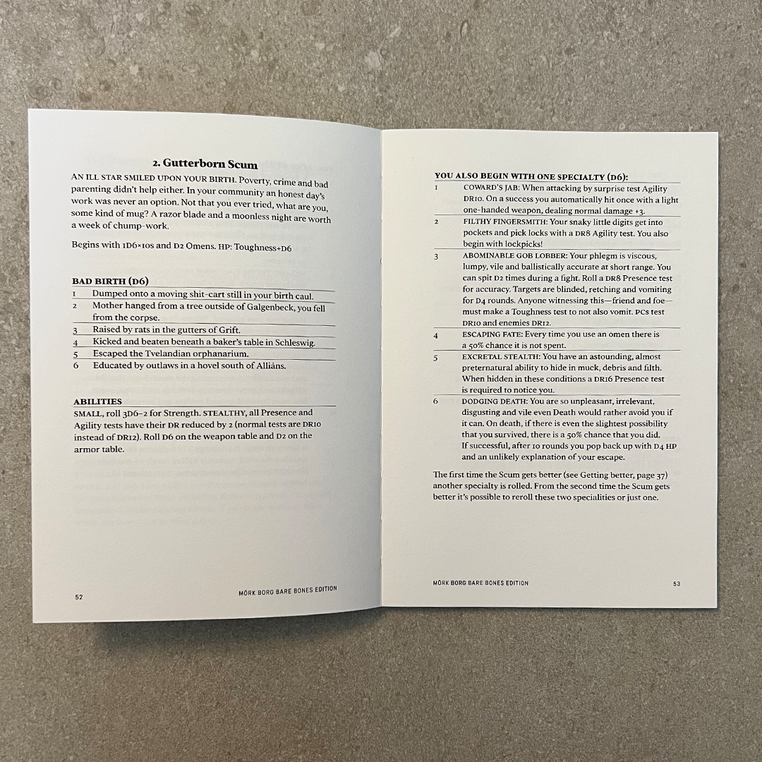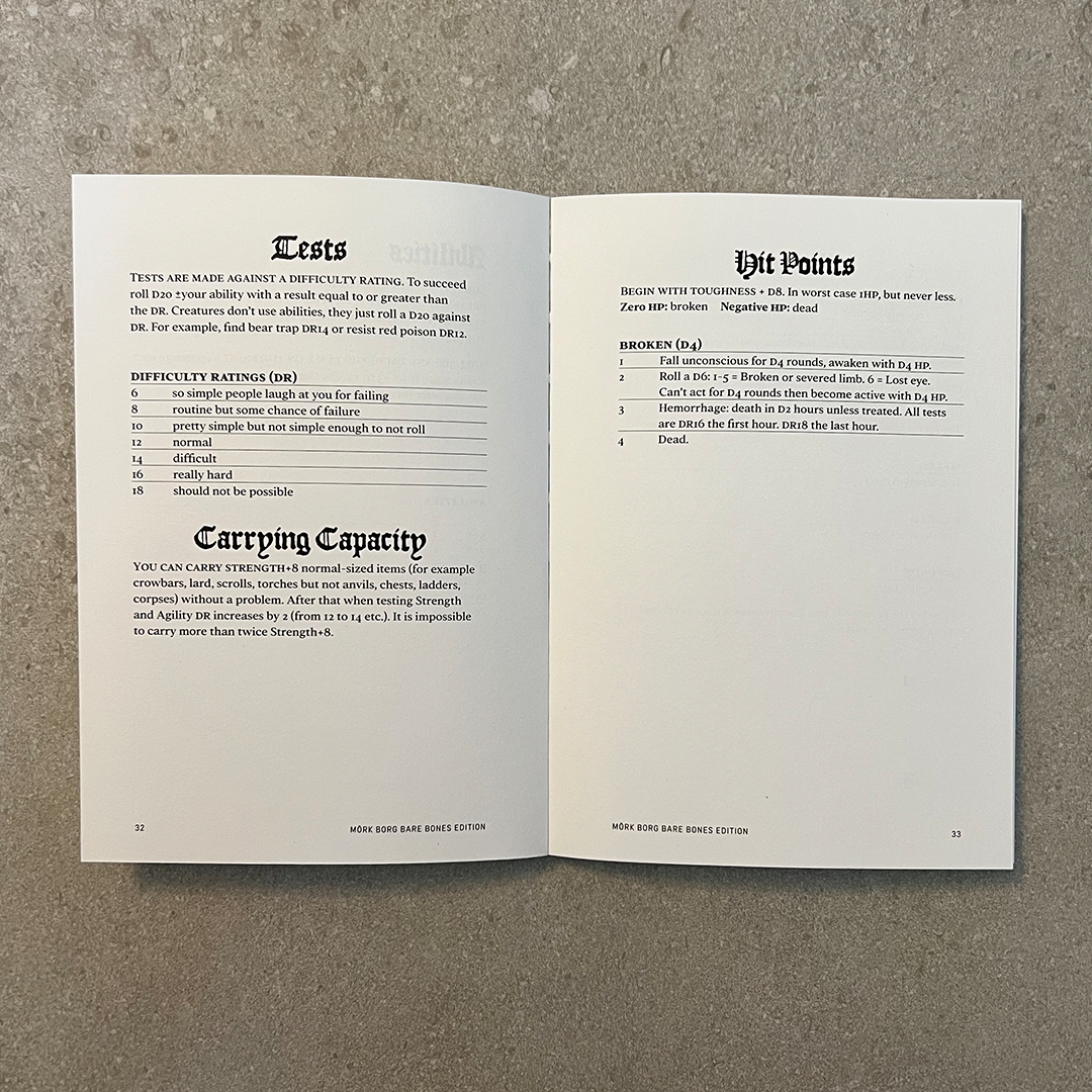 MÖRK BORG is a doom metal album of a game. A spiked flail to the face. Rules light, heavy everything else. This is the BARE BONES EDITION; free, (almost) artless and the typography and graphic design turned down from 11 all the way to a sensible 4-5.
