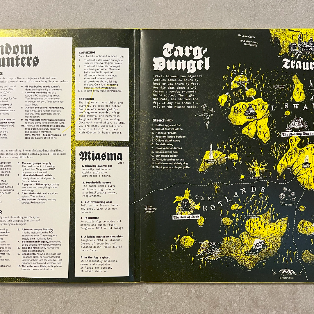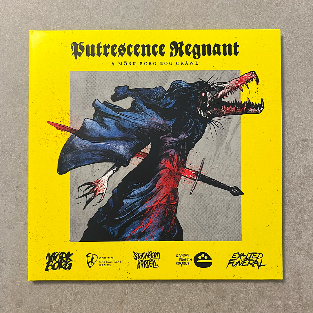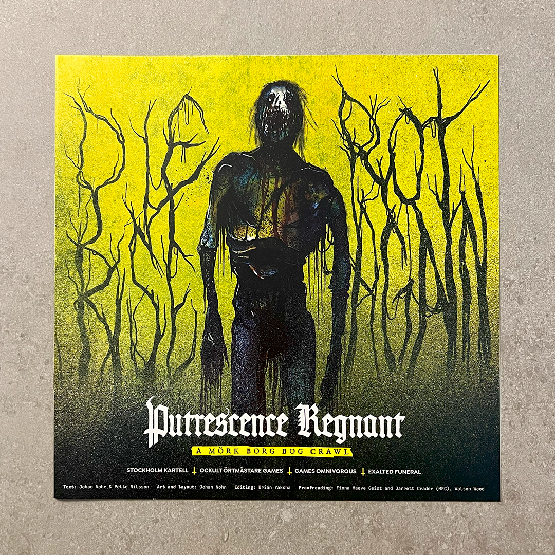 PUTRESCENCE REGNANT is a MÖRK BORG bog crawl in LP vinyl format, yellow and black marbled. The gatefold cover doubles up as an impromptu GM screen with a map of Targ-Dungel, rules for traveling, capsizing and drowning, information about the roaming undead bog bodies and a random encounter table for each of the three distinct sections of the bog: The Royal Swamps, Killer's Moor and The Rotlands.