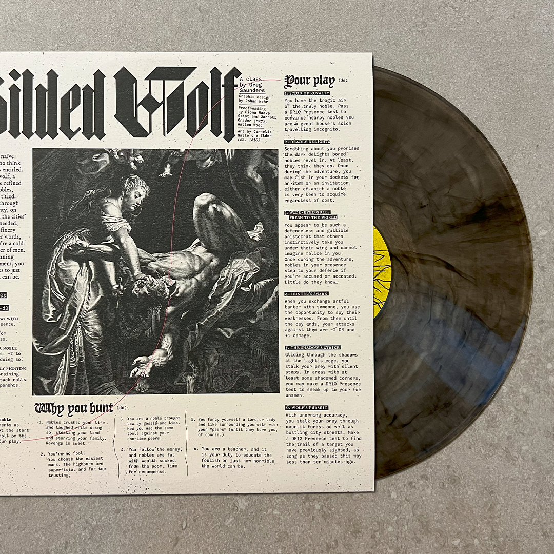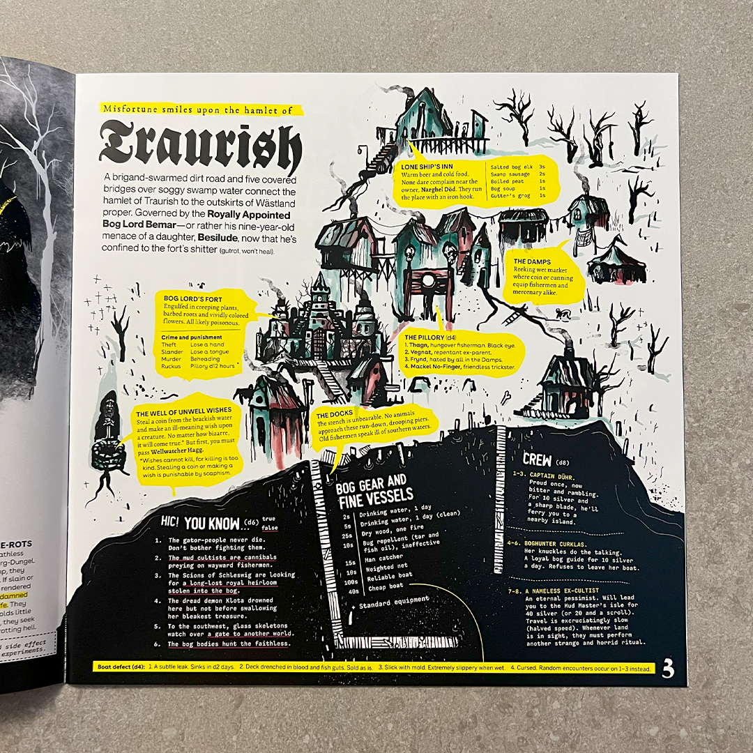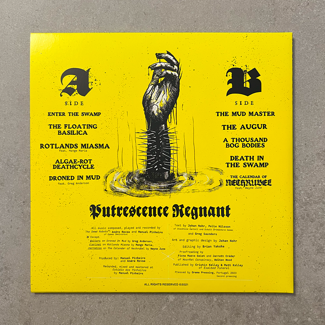 PUTRESCENCE REGNANT is a MÖRK BORG bog crawl in LP vinyl format, yellow and black marbled. The gatefold cover doubles up as an impromptu GM screen with a map of Targ-Dungel, rules for traveling, capsizing and drowning, information about the roaming undead bog bodies and a random encounter table for each of the three distinct sections of the bog: The Royal Swamps, Killer's Moor and The Rotlands.