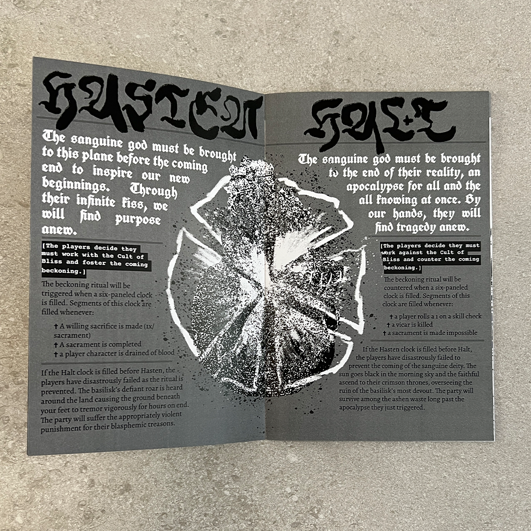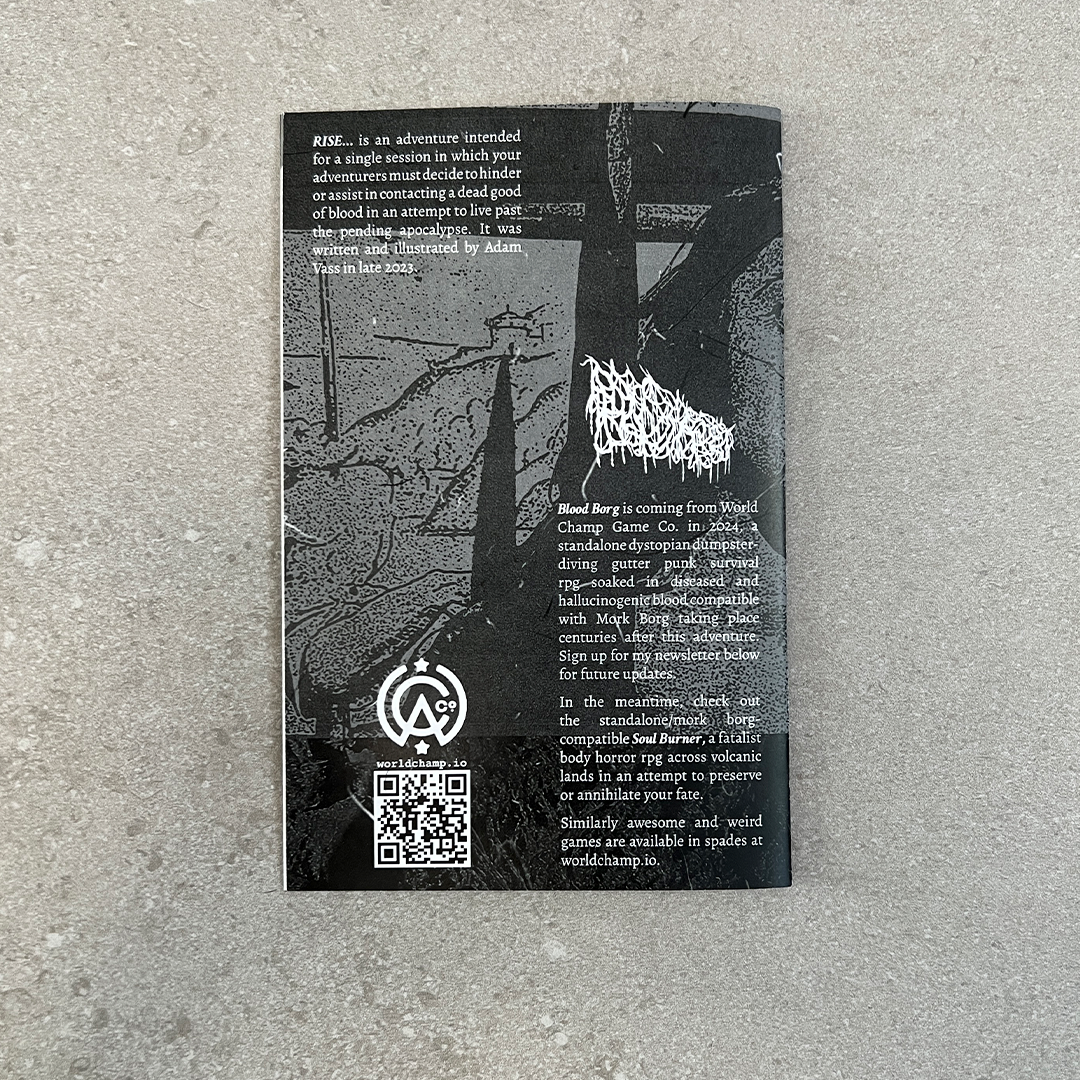 RISE… is an adventure intended for a single session in which your adventurers must decide to hinder or assist in contacting a dead good of blood in an attempt to live past the pending apocalypse. It was written and illustrated by Adam Vass in late 2023.