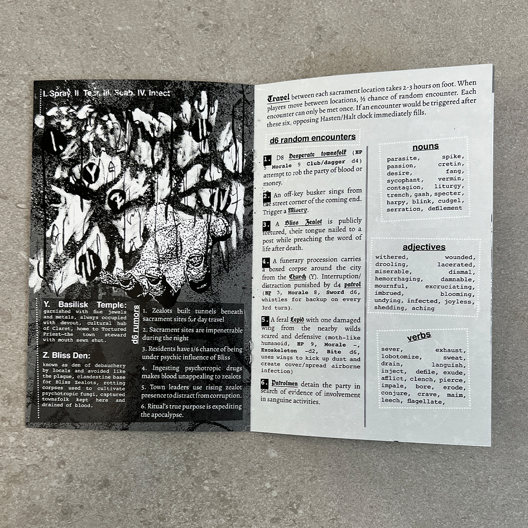 Blood Borg is coming from World Champ Game Co. in 2024, a standalone dystopian dumpster-diving gutter punk survival rpg soaked in diseased and hallucinogenic blood compatible with Mork Borg taking place centuries after this adventure. Sign up for my newsletter for future updates.