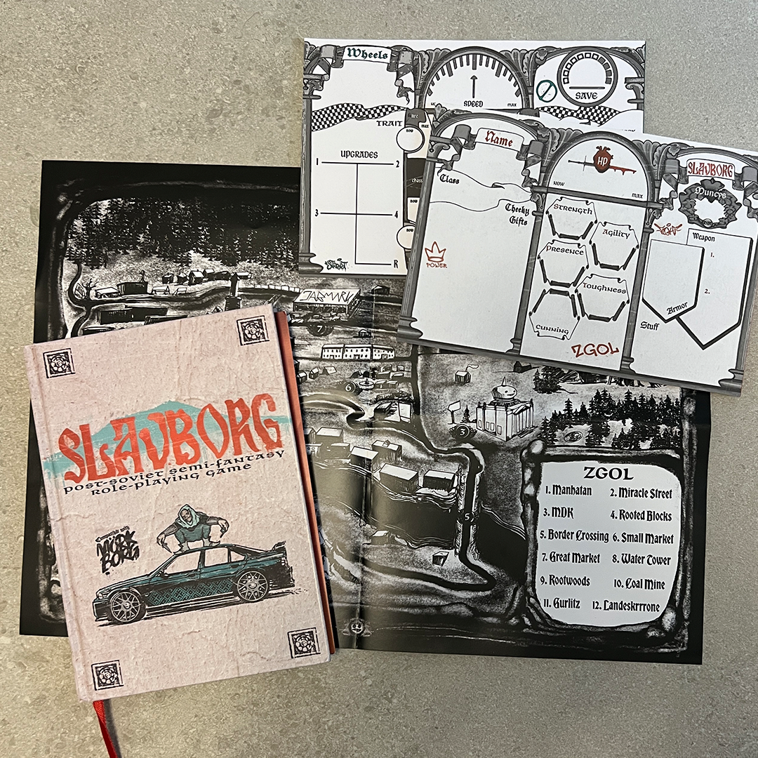 The bundle includes the book, an A3 map of Zgol, a pad of character sheets and a pad of wheels cheets.