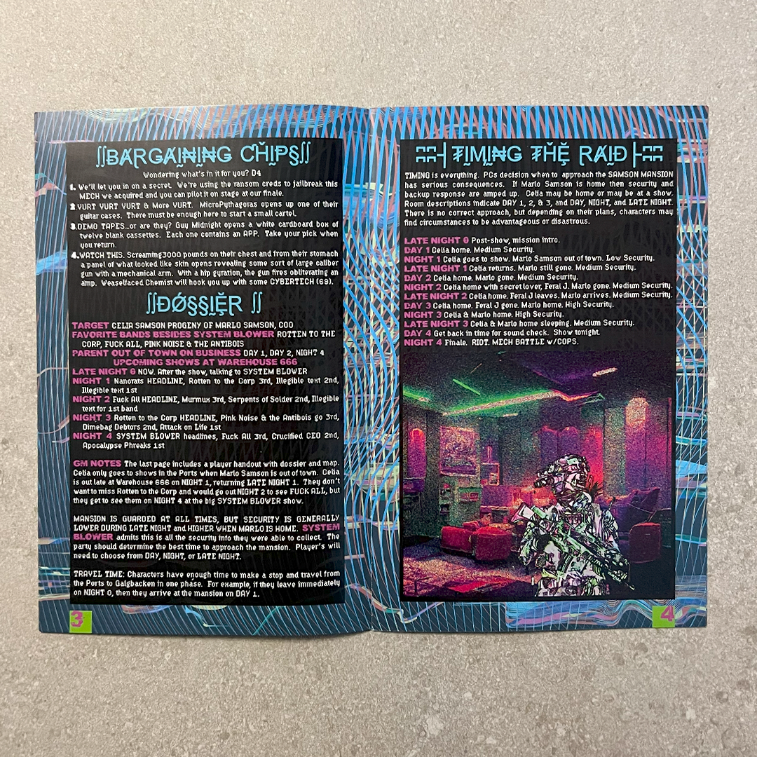 SYSTEM BLOWER has a job for you. Turns out that Celia Samson, the teen progeny of that moron exec at the top of this hill, Marlo Samson, is a huge SYSTEM BLOWER fan but hasn't gone full System Blower Army yet. This is where you come in. SYSTEM BLOWER has a plan that's going to get creds, piss off the hegemony, and stir up a media storm like never before. All you need to do is pull off this heist and create a scene so no one misses it! It would be great if you survived it...but that's not the point. Raid the mansion. Kidnap or convert Celia Samson to the cause, doesn't matter which, just be sure to get her to the finale show before soundcheck...and then it's time to BLOW THE SYSTEM!!!!