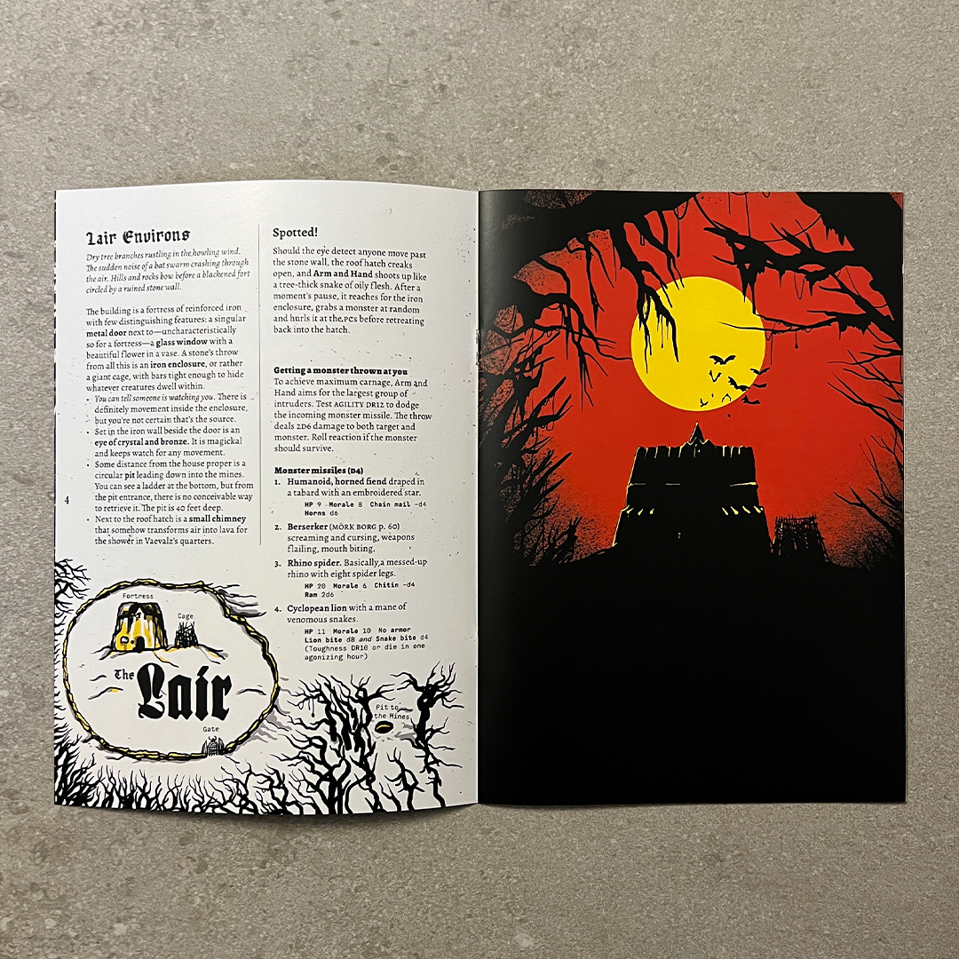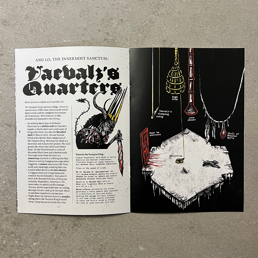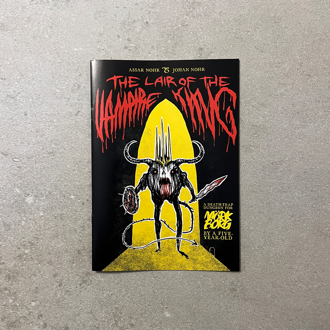 Pack your bag and grab your blade—the time has come to slay the Vampire King. Monsters thrown by a monstrous hand, lava-spewing flowers, devious cage traps and a hidden, magic sword. This is a 16-page dungeon delve for MÖRK BORG by a literal five-year-old.