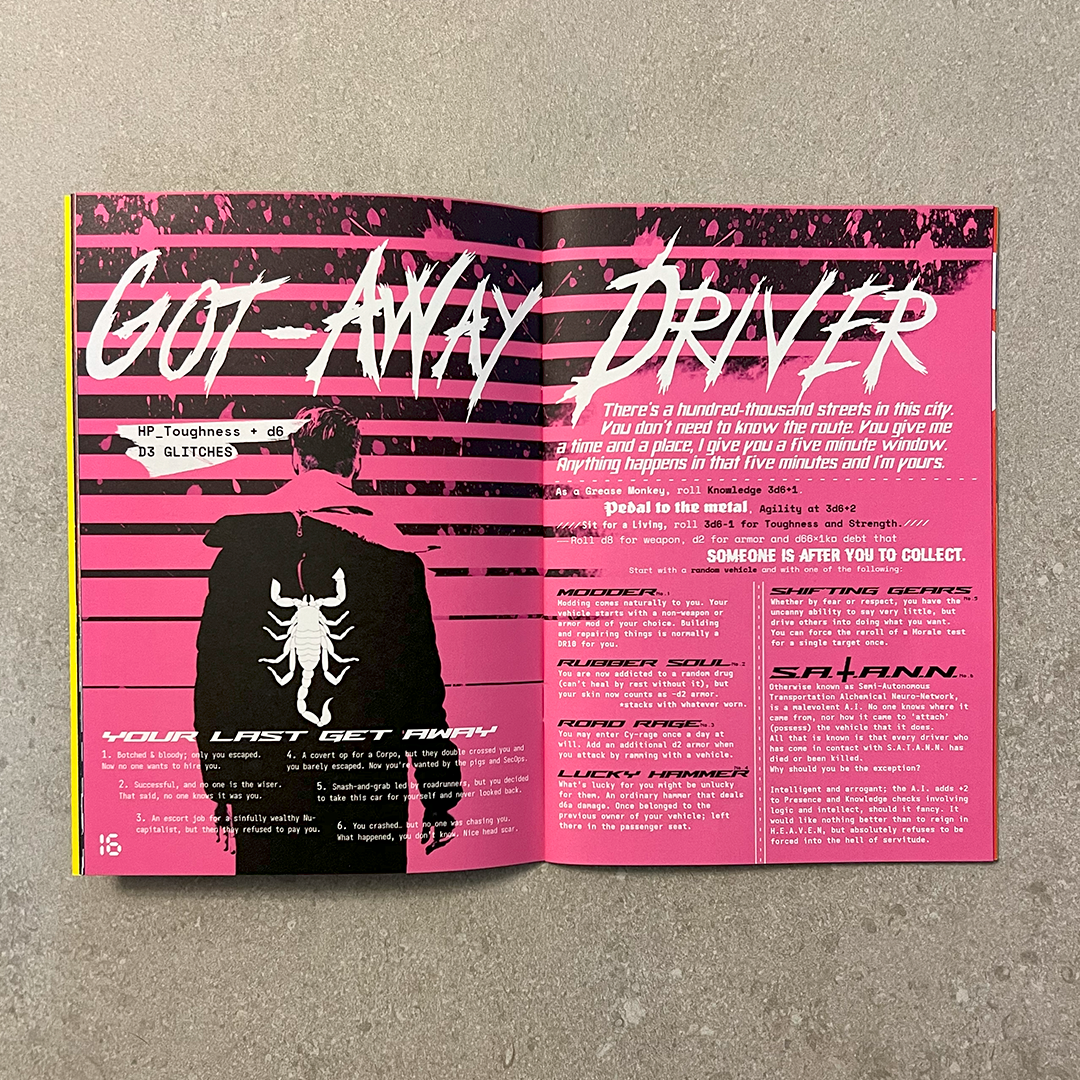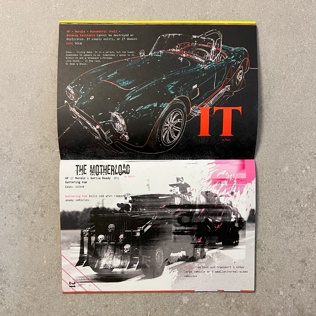 Too Fast to Live, Too Young to Die is a rules expansion for CY_BORG giving you the chance to drive fast and wreak carnage hanging out the passenger side window (or just crash headlong into it, your mileage may very).
