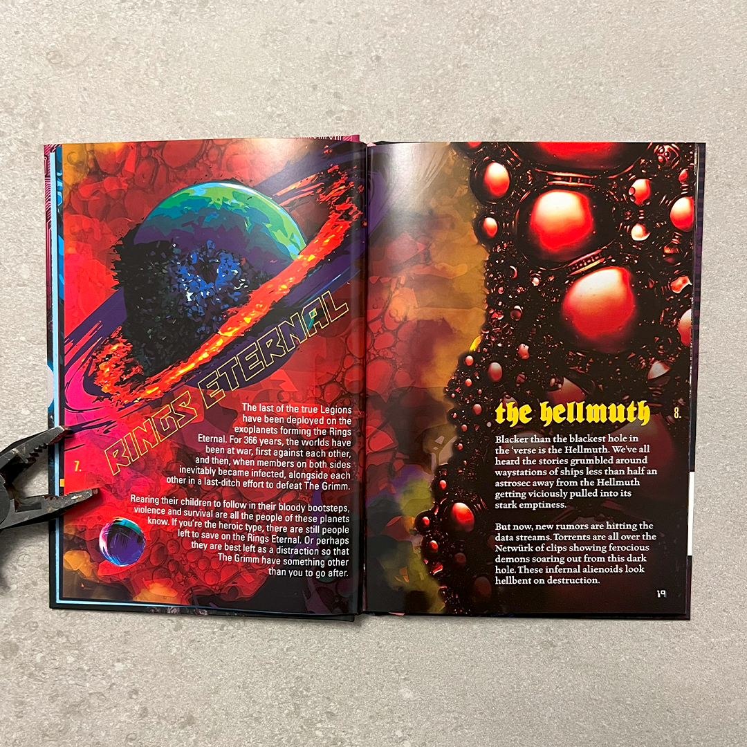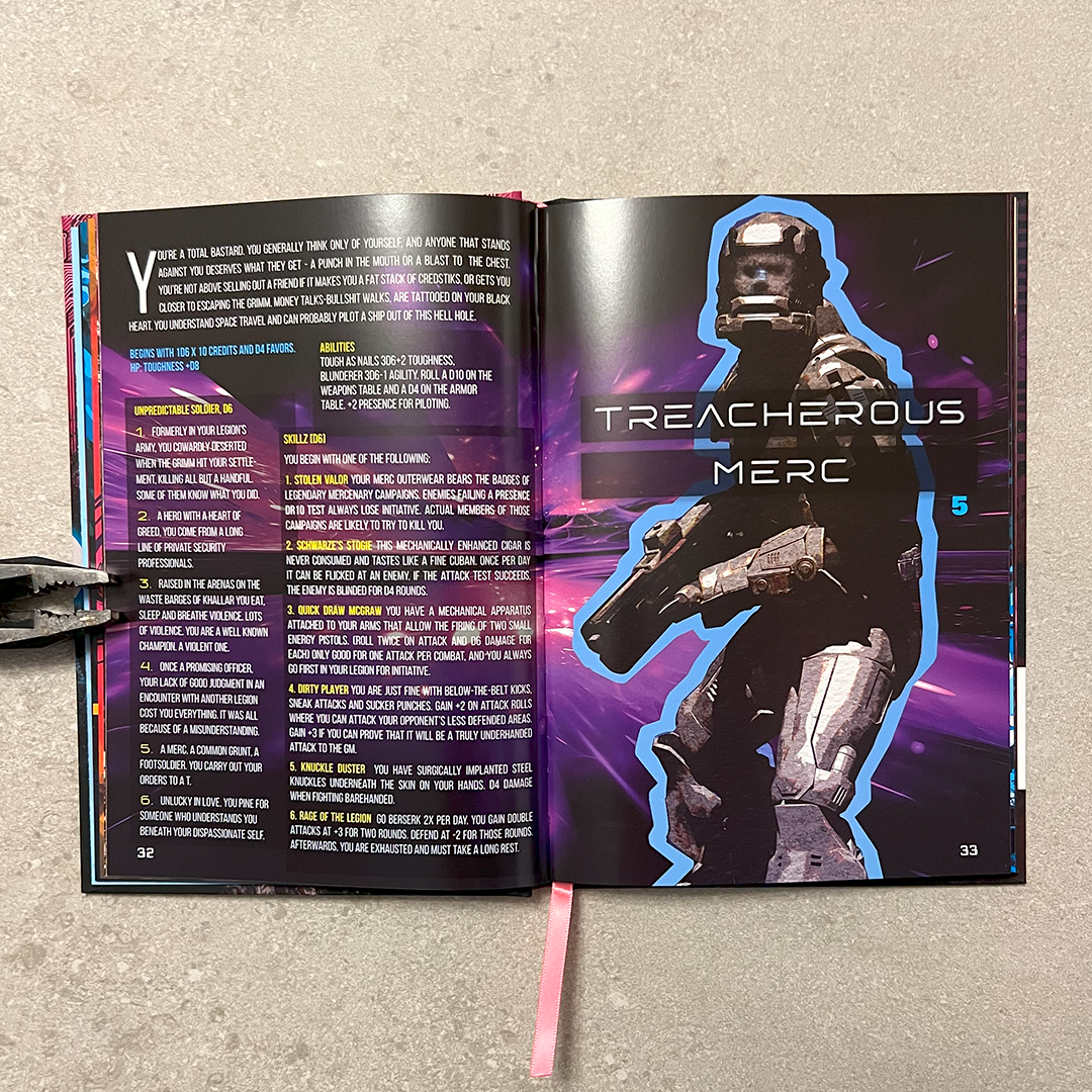 An Introductory Adventure – Death Aboard the Conundrum, a broken-down science ship is believed to have a piece needed to build The Gate of Infinite Stars. This relic could fetch a king’s ransom in cred sticks, or maybe even secure you and your Legion a way out of this ‘verse. It includes random charts so the adventure can be replayed numerous times.