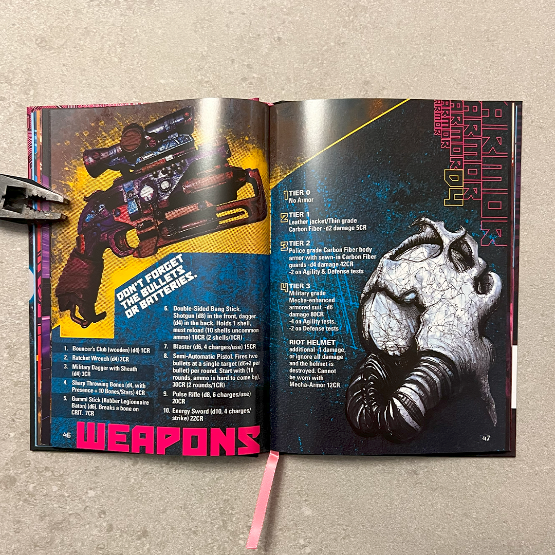 - 8 Fast & Easy Steps to Character Creation – Rolling dice to determine everything about your character sure makes it feel like they will not live long. This includes 8 character classes like the MAnchiNe, Emo|Bot, and The Harvester. It also has charts for Irritating Idiosyncrasies, Misspent Youth, and Battle Scars to really give your character that extra level of filth.